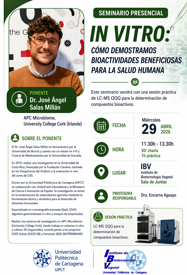 El seminario tendrá lugar en la Sala de Juntas del IBV de 11:30 a 13:30 e incluye una sesión práctica sobre determinación de compuestos bioactivos en LC-MA QQQ.